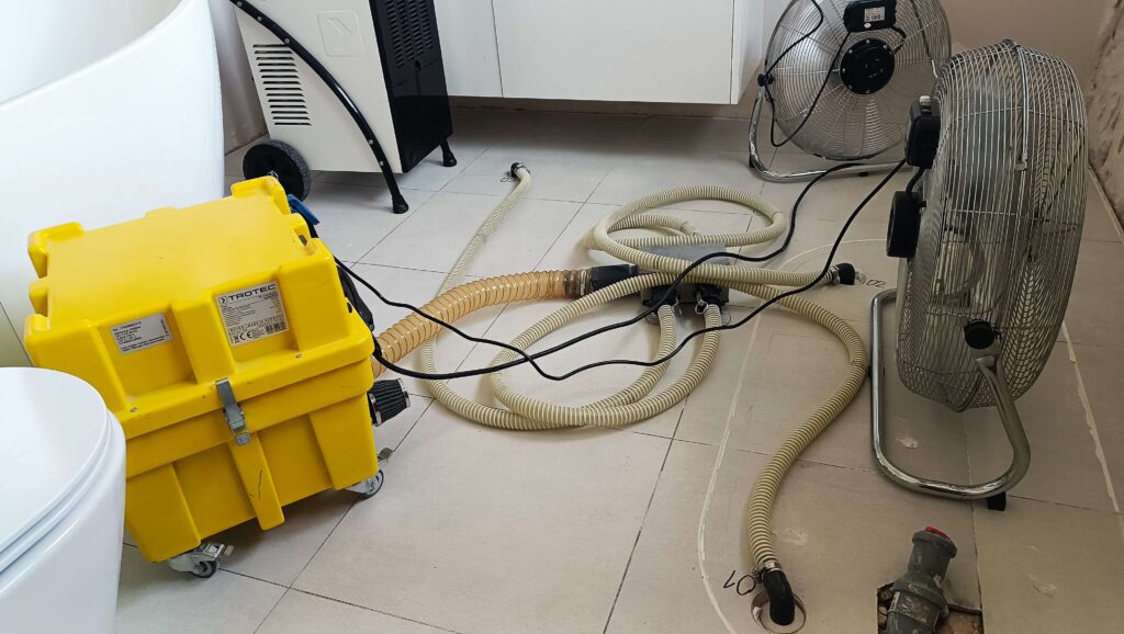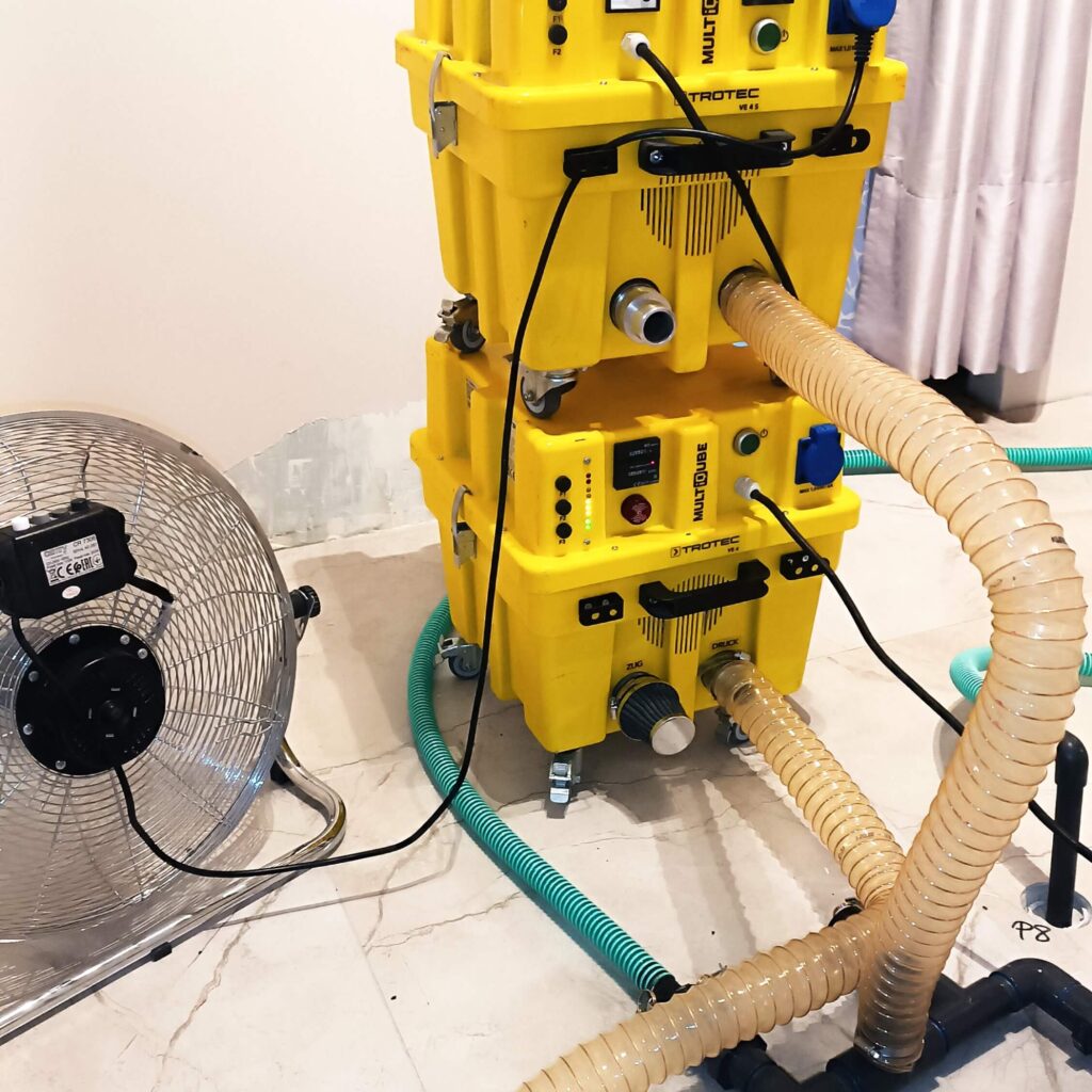 Podobnie jak w przypadku osuszania kondensacyjnego przy zastosowaniu osuszania podposadzkowego wykonujemy dokładne oględziny miejsca zalania w celu identyfikacji skutków i zakresu działań. Na tym etapie dokonujemy pomiarów wilgotności warstwy podposadzkowej i ścian za pomocą higrometru i miernika wilgotności. Następnym krokiem jest opracowanie planu osuszania, dobór urządzeń osuszających i wykonanie wyceny.